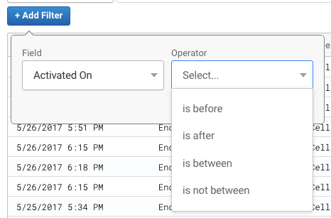 Tome en cuenta que los operadores disponibles se basan en el campo seleccionado. En el siguiente ejemplo, la lista de operadores del campo Capabilities (Capacidades) es distinta a la lista anterior para el campo Activated On (Activado el).